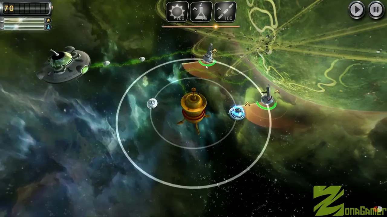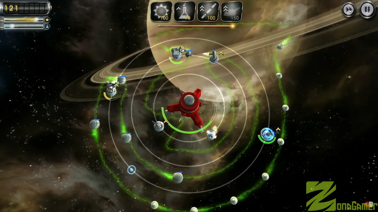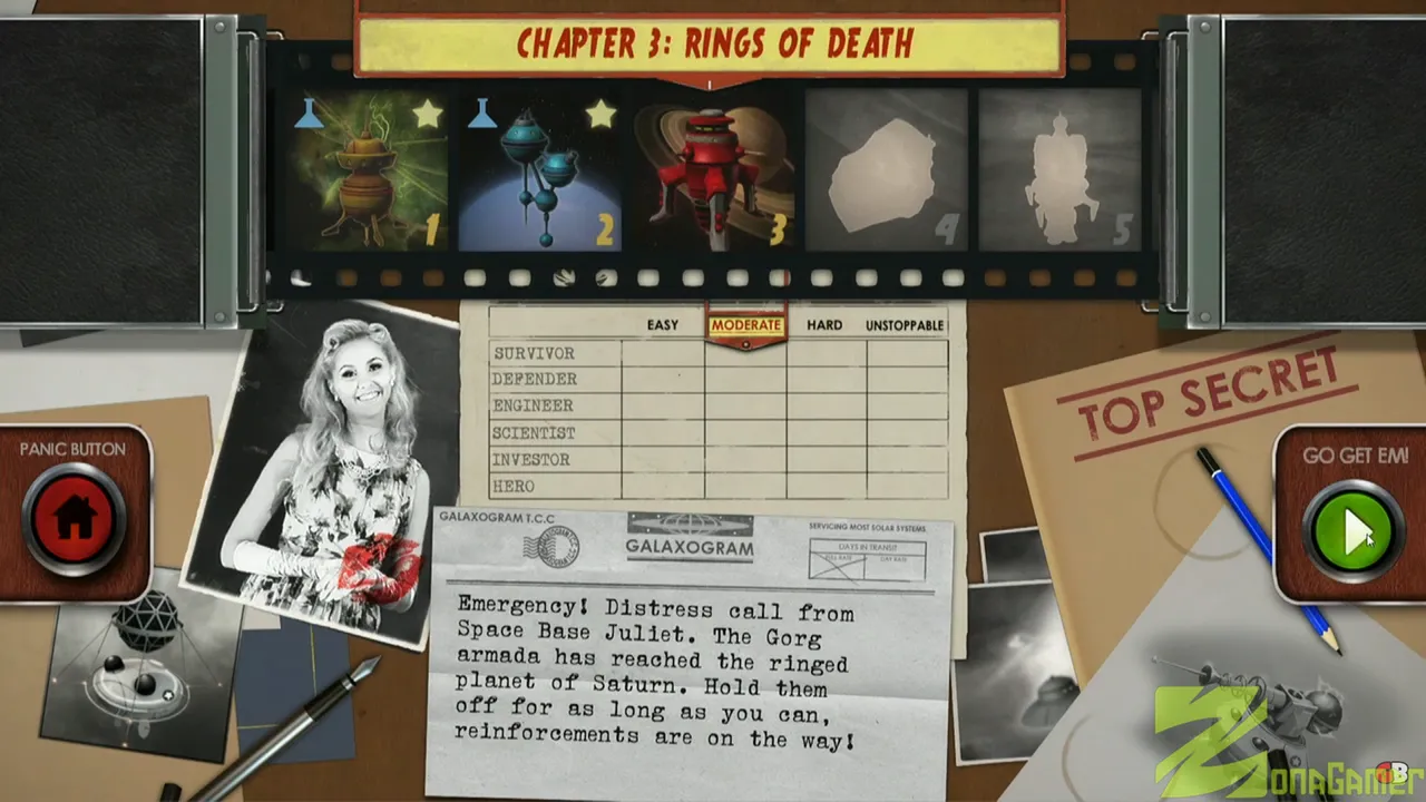 Defiende el sistema solar de una invasión alienígena típica de los años 50. En lugar de torres estáticas, colocarás satélites en órbitas alrededor de planetas y estaciones, y podrás rotar esas órbitas estratégicamente para interceptar oleadas enemigas. Todo se acompaña con escenas cinematográficas retro grabadas con maquetas y actores, evocando un clásico cine B de ciencia ficción.